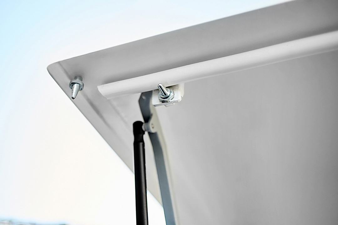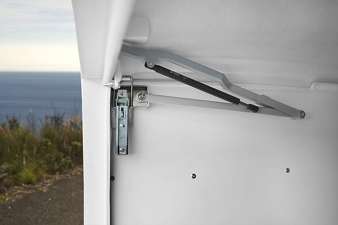 Toit léger et durable, avec raidisseurs composites innovants, se soulève et se baisse sans effort. Elle est aérodynamique et possède des caractéristiques de haute résistance, protégeant de manière fiable votre moto sur la route et dans le parking