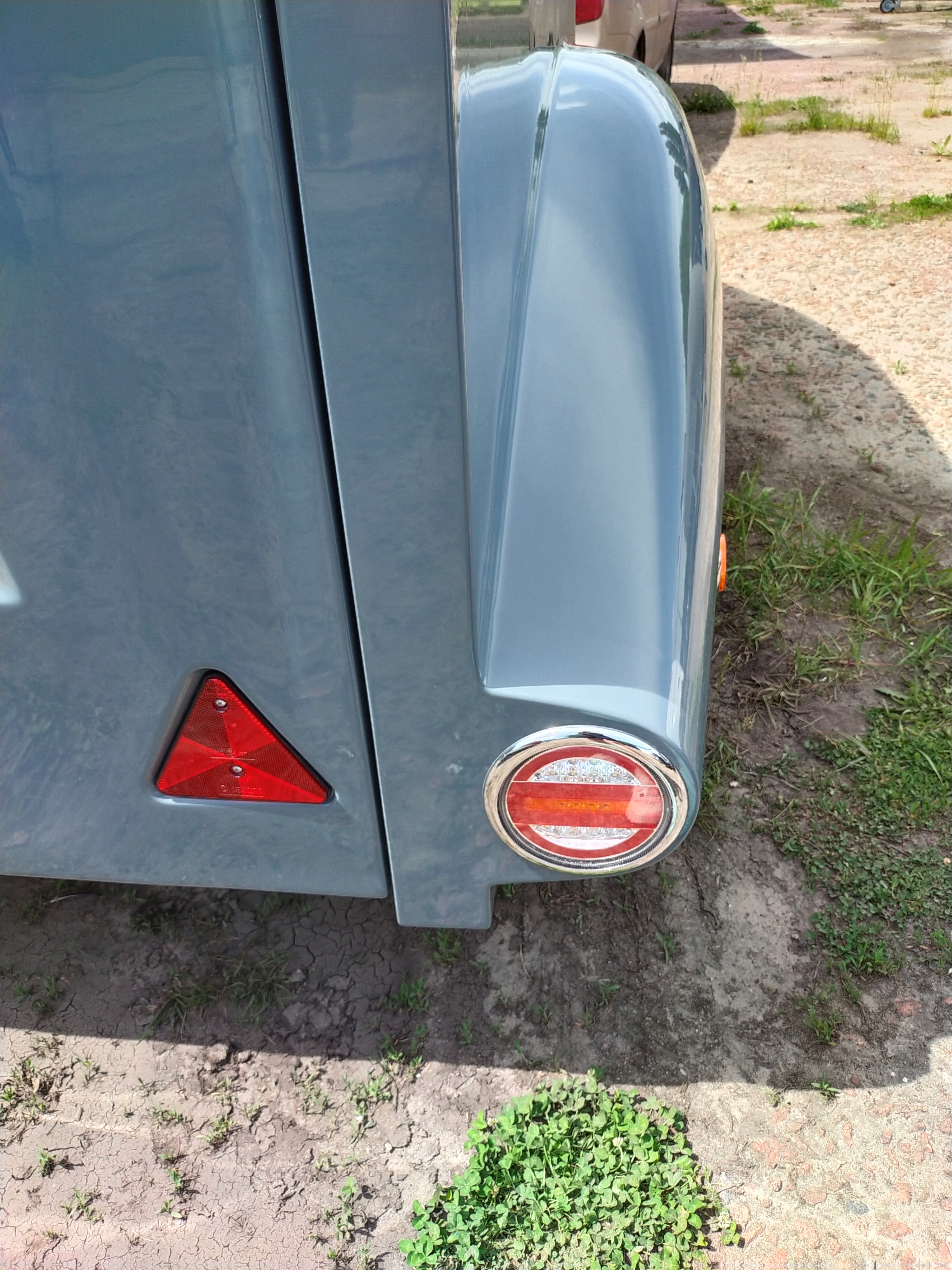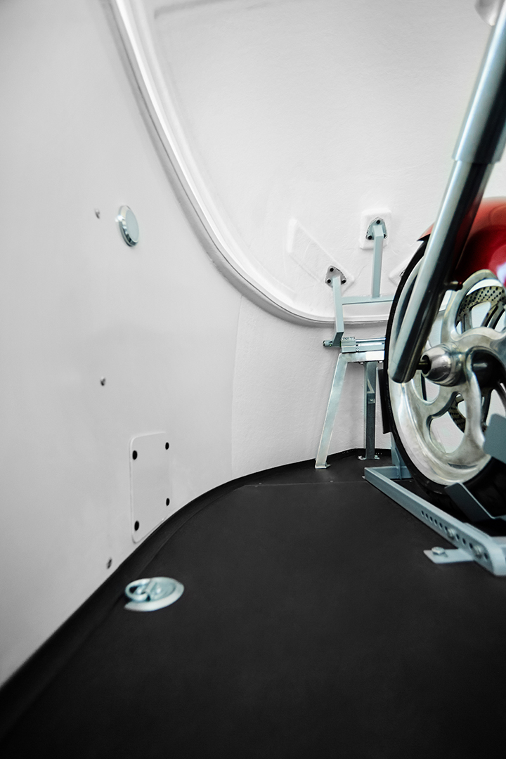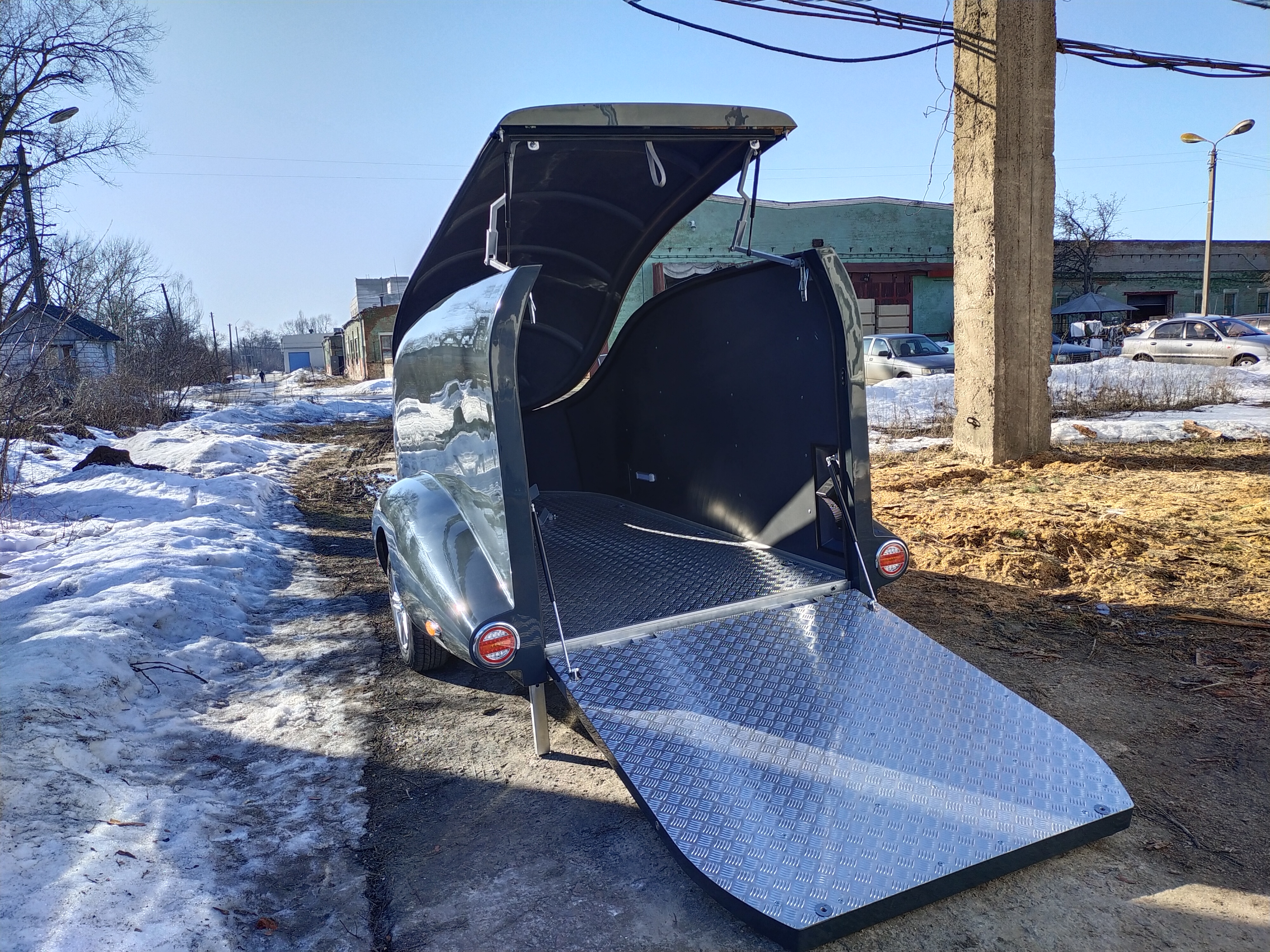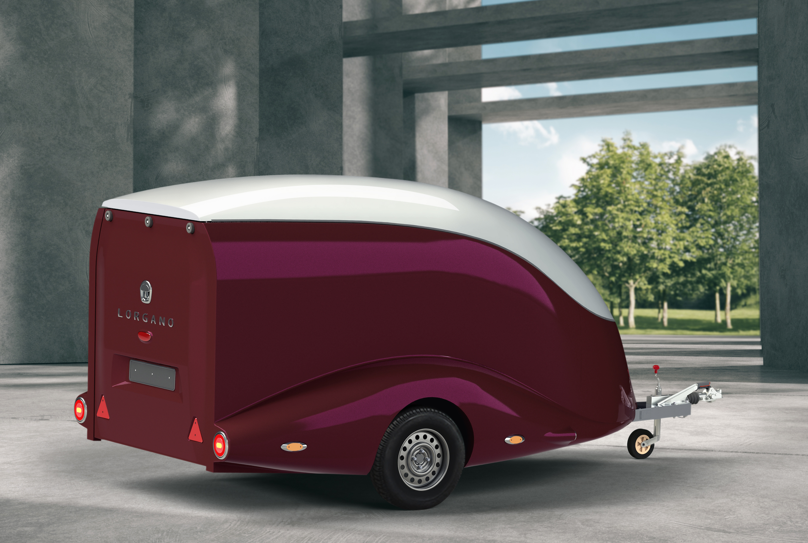 Le corps est assemblé autour du cadre, le recouvrant complètement (il n’es pas placé sur le dessus, comme dans les remorques de ce type). Ainsi, il forme un ensemble avec le cadre, et non une "superstructure" placée au-dessus du cadre. La remorque obtient le profil le plus bas possible et ressemble plus à un bolie de course rétro