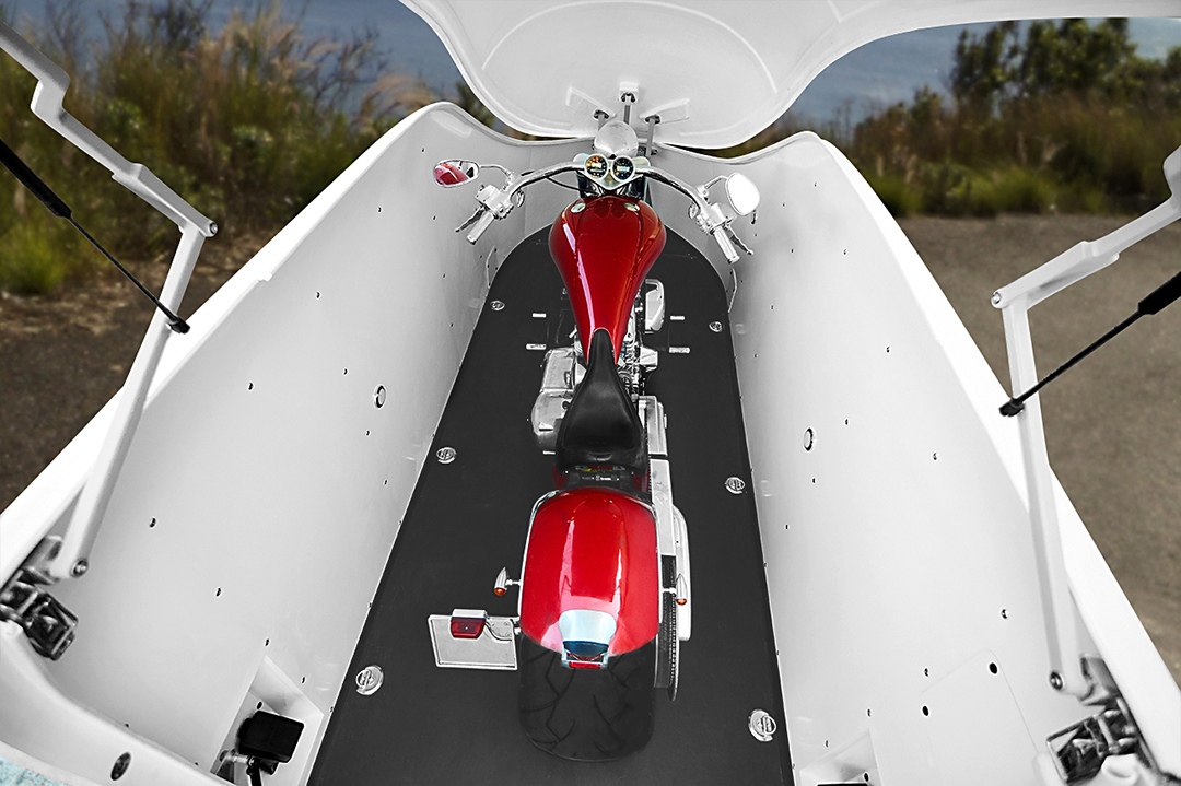 Toit léger et durable, avec raidisseurs composites innovants, se soulève et se baisse sans effort. Elle est aérodynamique et possède des caractéristiques de haute résistance, protégeant de manière fiable votre moto sur la route et dans le parking